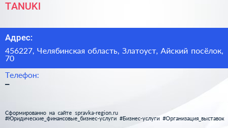 TANUKI по адресу 456227, Челябинская область, Златоуст, Айский посёлок, 70 в дальнейшем Организация, размещена в следующих категориях: