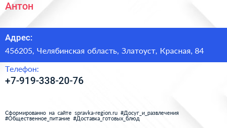 Антон по адресу 456205, Челябинская область, Златоуст, Красная, 84 в дальнейшем Организация, размещена в следующих категориях: