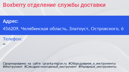 Boxberry, отделение службы доставки по адресу 456209, Челябинская область, Златоуст, Островского, 6 в дальнейшем Организация, размещена в следующих категориях: