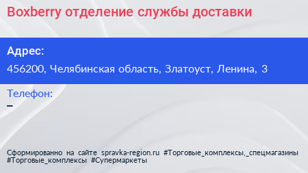 Boxberry, отделение службы доставки по адресу 456200, Челябинская область, Златоуст, Ленина, 3 в дальнейшем Организация, размещена в следующих категориях: