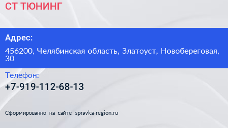 CT ТЮНИНГ по адресу 456200, Челябинская область, Златоуст, Новобереговая, 30 в дальнейшем Организация, размещена в следующих категориях: