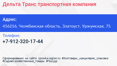 Дельта-Транс, транспортная компания по адресу 456216, Челябинская область, Златоуст, Уржумская, 75 в дальнейшем Организация, размещена в следующих категориях: