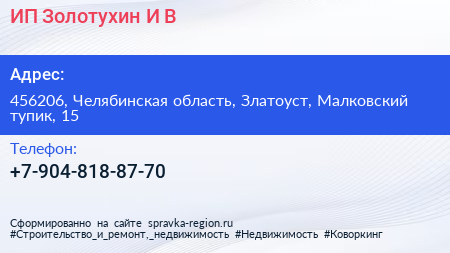 ИП Золотухин И.В. по адресу 456206, Челябинская область, Златоуст, Малковский тупик, 15 в дальнейшем Организация, размещена в следующих категориях: