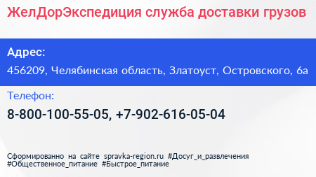 ЖелДорЭкспедиция, служба доставки грузов по адресу 456209, Челябинская область, Златоуст, Островского, 6а в дальнейшем Организация, размещена в следующих категориях: