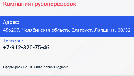 Компания грузоперевозок по адресу 456207, Челябинская область, Златоуст, Лапшина, 30/32 в дальнейшем Организация, размещена в следующих категориях: