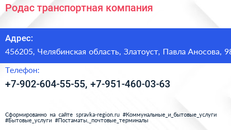 Родас, транспортная компания по адресу 456205, Челябинская область, Златоуст, Павла Аносова, 98 в дальнейшем Организация, размещена в следующих категориях: