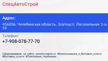 СпецАвтоСтрой по адресу 456206, Челябинская область, Златоуст, Лесопильная 1-я, 16 в дальнейшем Организация, размещена в следующих категориях: