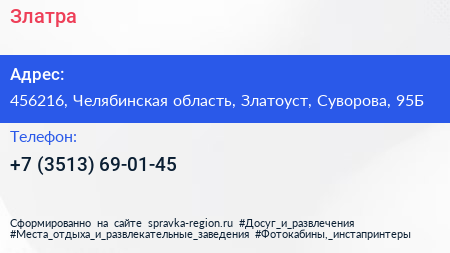 Златра по адресу 456216, Челябинская область, Златоуст, Суворова, 95Б в дальнейшем Организация, размещена в следующих категориях: