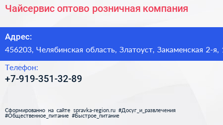 Чайсервис, оптово-розничная компания по адресу 456203, Челябинская область, Златоуст, Закаменская 2-я, 1 в дальнейшем Организация, размещена в следующих категориях: