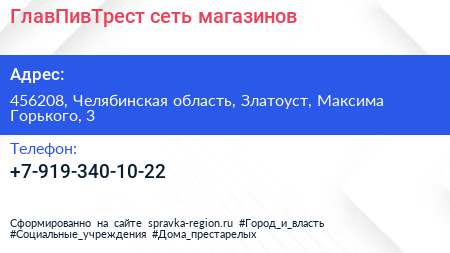 ГлавПивТрест, сеть магазинов по адресу 456208, Челябинская область, Златоуст, Максима Горького, 3 в дальнейшем Организация, размещена в следующих категориях: