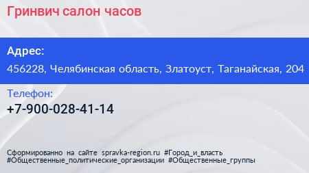 Гринвич, салон часов по адресу 456228, Челябинская область, Златоуст, Таганайская, 204 в дальнейшем Организация, размещена в следующих категориях: