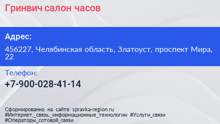 Гринвич, салон часов по адресу 456227, Челябинская область, Златоуст, проспект Мира, 22 в дальнейшем Организация, размещена в следующих категориях: