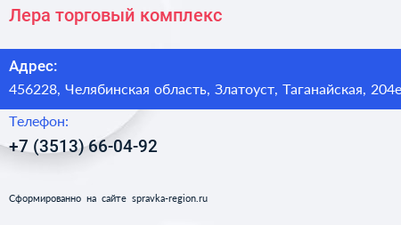 Лера, торговый комплекс по адресу 456228, Челябинская область, Златоуст, Таганайская, 204е в дальнейшем Организация, размещена в следующих категориях:
