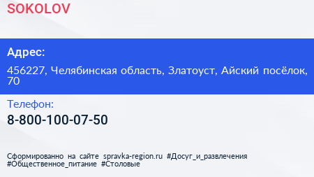 SOKOLOV по адресу 456227, Челябинская область, Златоуст, Айский посёлок, 70 в дальнейшем Организация, размещена в следующих категориях: