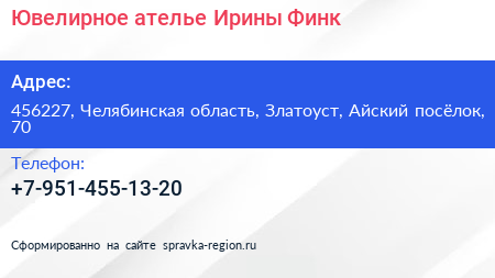 Ювелирное ателье Ирины Финк по адресу 456227, Челябинская область, Златоуст, Айский посёлок, 70 в дальнейшем Организация, размещена в следующих категориях: