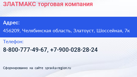 ЗЛАТМАКС, торговая компания по адресу 456209, Челябинская область, Златоуст, Шоссейная, 7к в дальнейшем Организация, размещена в следующих категориях: