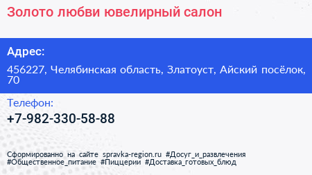 Золото любви, ювелирный салон по адресу 456227, Челябинская область, Златоуст, Айский посёлок, 70 в дальнейшем Организация, размещена в следующих категориях: