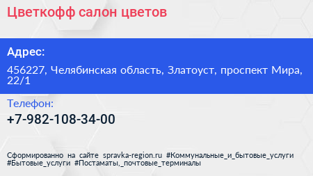 Цветкофф, салон цветов по адресу 456227, Челябинская область, Златоуст, проспект Мира, 22/1 в дальнейшем Организация, размещена в следующих категориях: