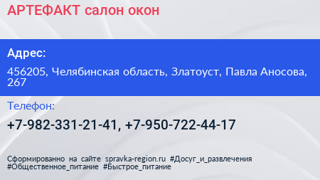 АРТЕФАКТ, салон окон по адресу 456205, Челябинская область, Златоуст, Павла Аносова, 267 в дальнейшем Организация, размещена в следующих категориях: