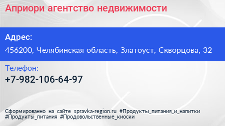 Априори, агентство недвижимости по адресу 456200, Челябинская область, Златоуст, Скворцова, 32 в дальнейшем Организация, размещена в следующих категориях:
