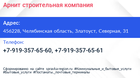Арнит, строительная компания по адресу 456228, Челябинская область, Златоуст, Северная, 31 в дальнейшем Организация, размещена в следующих категориях: