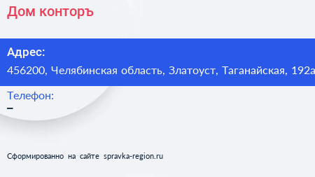 Дом конторъ по адресу 456200, Челябинская область, Златоуст, Таганайская, 192а в дальнейшем Организация, размещена в следующих категориях: