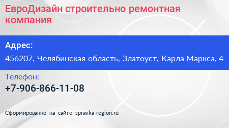 ЕвроДизайн, строительно-ремонтная компания по адресу 456207, Челябинская область, Златоуст, Карла Маркса, 4 в дальнейшем Организация, размещена в следующих категориях: