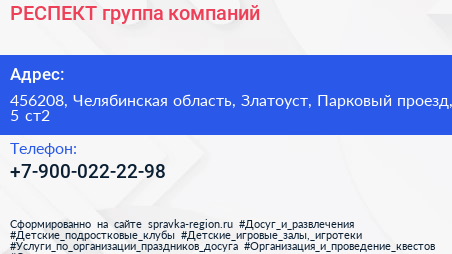 РЕСПЕКТ, группа компаний по адресу 456208, Челябинская область, Златоуст, Парковый проезд, 5 ст2 в дальнейшем Организация, размещена в следующих категориях: