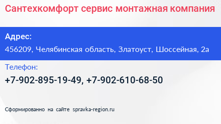 Сантехкомфорт-сервис, монтажная компания по адресу 456209, Челябинская область, Златоуст, Шоссейная, 2а в дальнейшем Организация, размещена в следующих категориях: