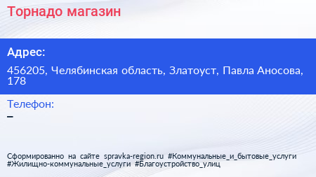 Торнадо, магазин по адресу 456205, Челябинская область, Златоуст, Павла Аносова, 178 в дальнейшем Организация, размещена в следующих категориях: