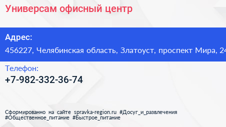 Универсам, офисный центр по адресу 456227, Челябинская область, Златоуст, проспект Мира, 24 в дальнейшем Организация, размещена в следующих категориях: