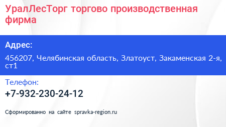 УралЛесТорг, торгово-производственная фирма по адресу 456207, Челябинская область, Златоуст, Закаменская 2-я, ст1 в дальнейшем Организация, размещена в следующих категориях: