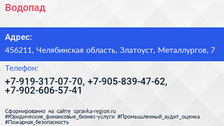 Водопад по адресу 456211, Челябинская область, Златоуст, Металлургов, 7 в дальнейшем Организация, размещена в следующих категориях: