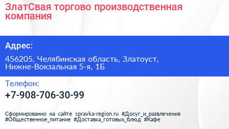 ЗлатСвая, торгово-производственная компания по адресу 456205, Челябинская область, Златоуст, Нижне-Вокзальная 5-я, 1Б в дальнейшем Организация, размещена в следующих категориях: