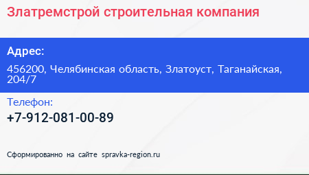 Златремстрой, строительная компания по адресу 456200, Челябинская область, Златоуст, Таганайская, 204/7 в дальнейшем Организация, размещена в следующих категориях: