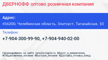 ДВЕРНОФФ, оптово-розничная компания по адресу 456200, Челябинская область, Златоуст, Таганайская, 10 в дальнейшем Организация, размещена в следующих категориях:
