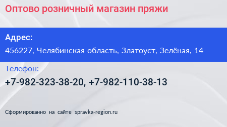 Оптово-розничный магазин пряжи по адресу 456227, Челябинская область, Златоуст, Зелёная, 14 в дальнейшем Организация, размещена в следующих категориях: