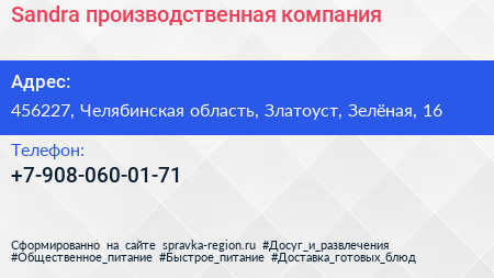 Sandra, производственная компания по адресу 456227, Челябинская область, Златоуст, Зелёная, 16 в дальнейшем Организация, размещена в следующих категориях: