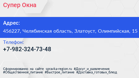 Супер Окна по адресу 456227, Челябинская область, Златоуст, Олимпийская, 15 в дальнейшем Организация, размещена в следующих категориях: