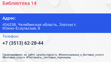 Библиотека №14 по адресу 456238, Челябинская область, Златоуст, Южно-Есаульская, 8 в дальнейшем Организация, размещена в следующих категориях: