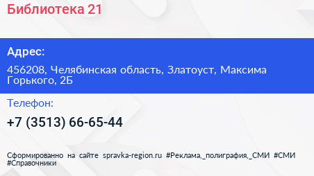 Библиотека №21 по адресу 456208, Челябинская область, Златоуст, Максима Горького, 2Б в дальнейшем Организация, размещена в следующих категориях: