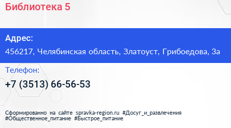 Библиотека №5 по адресу 456217, Челябинская область, Златоуст, Грибоедова, 3а в дальнейшем Организация, размещена в следующих категориях: