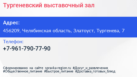 Тургеневский, выставочный зал по адресу 456209, Челябинская область, Златоуст, Тургенева, 7 в дальнейшем Организация, размещена в следующих категориях: