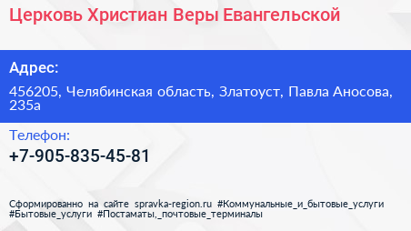 Церковь Христиан Веры Евангельской по адресу 456205, Челябинская область, Златоуст, Павла Аносова, 235а в дальнейшем Организация, размещена в следующих категориях: