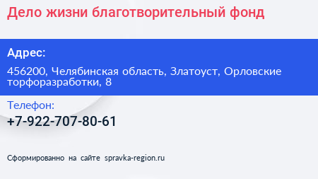 Дело жизни, благотворительный фонд по адресу 456200, Челябинская область, Златоуст, Орловские торфоразработки, 8 в дальнейшем Организация, размещена в следующих категориях: