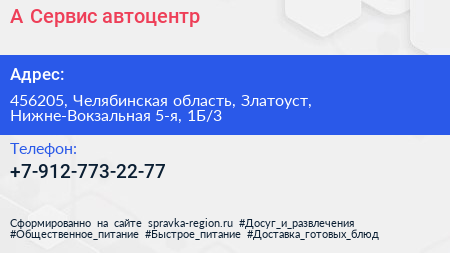 А-Сервис, автоцентр по адресу 456205, Челябинская область, Златоуст, Нижне-Вокзальная 5-я, 1Б/3 в дальнейшем Организация, размещена в следующих категориях: