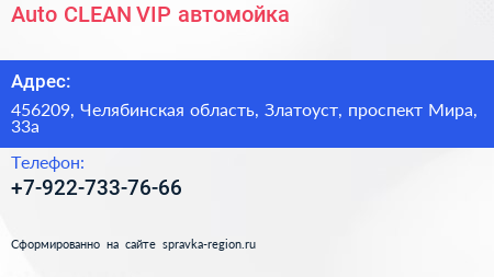 Auto CLEAN VIP, автомойка по адресу 456209, Челябинская область, Златоуст, проспект Мира, 33а в дальнейшем Организация, размещена в следующих категориях: