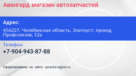 Авангард, магазин автозапчастей по адресу 456227, Челябинская область, Златоуст, проезд Профсоюзов, 12а в дальнейшем Организация, размещена в следующих категориях: