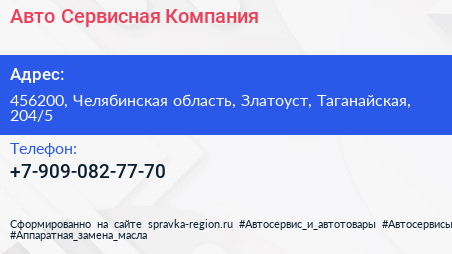 Авто-Сервисная Компания по адресу 456200, Челябинская область, Златоуст, Таганайская, 204/5 в дальнейшем Организация, размещена в следующих категориях: