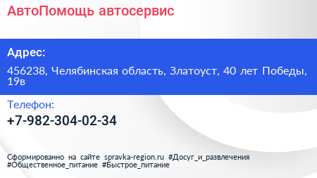 АвтоПомощь, автосервис по адресу 456238, Челябинская область, Златоуст, 40 лет Победы, 19в в дальнейшем Организация, размещена в следующих категориях: